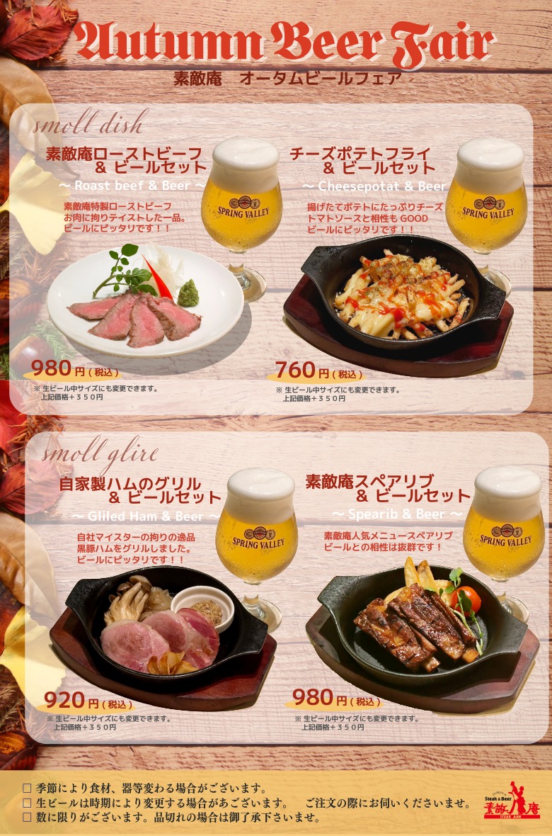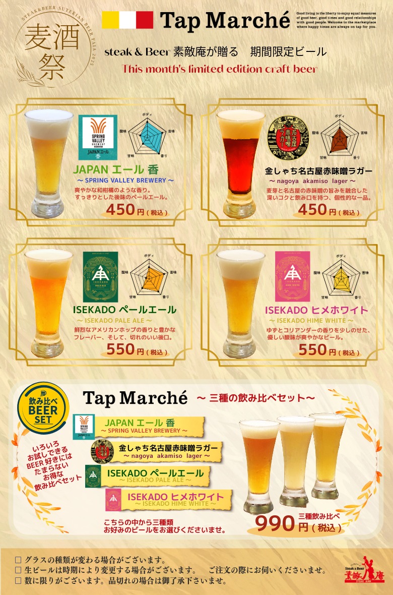 AutumnBeer ~秋限定ビールフェア開催~ 2025/09/19 AutumnBeer ~秋限定ビールフェア開催~ 涼やかな秋の宵に、至福の一杯を。 「素敵庵オータムフェア」では、選りすぐりのクラフトビールと素敵庵人気メニューのマリアージュをご用意しました。 食欲の秋にピッタリな五感で楽しむ“ビールの祭典”をどうぞ。 🗓開催期間:9月20日~11月30日 📍開催店舗:素敵庵本店 素敵庵アミュプラザ鹿児島店 投稿ナビゲーション « Autumn menu 素敵庵 秋の味覚フェア今日から三日間 肉の日!! »